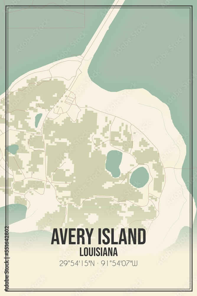 Retro US city map of Avery Island, Louisiana. Vintage street map